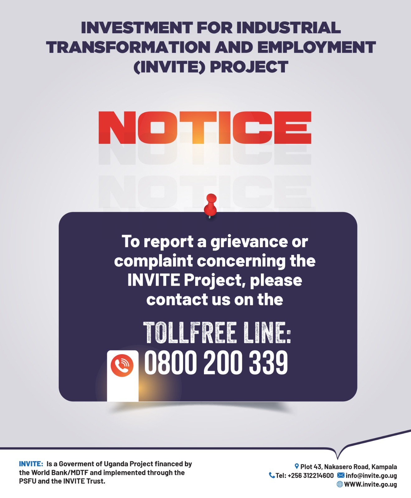 The Investment for Industrial Transformation and Employment (INVITE) Project is a Government of Uganda (GoU) initiative financed by the World Bank and other development partners including the Netherlands, the United Kingdom, and Sweden through a Multi-Donor Trust Fund (MDTF) Grant.